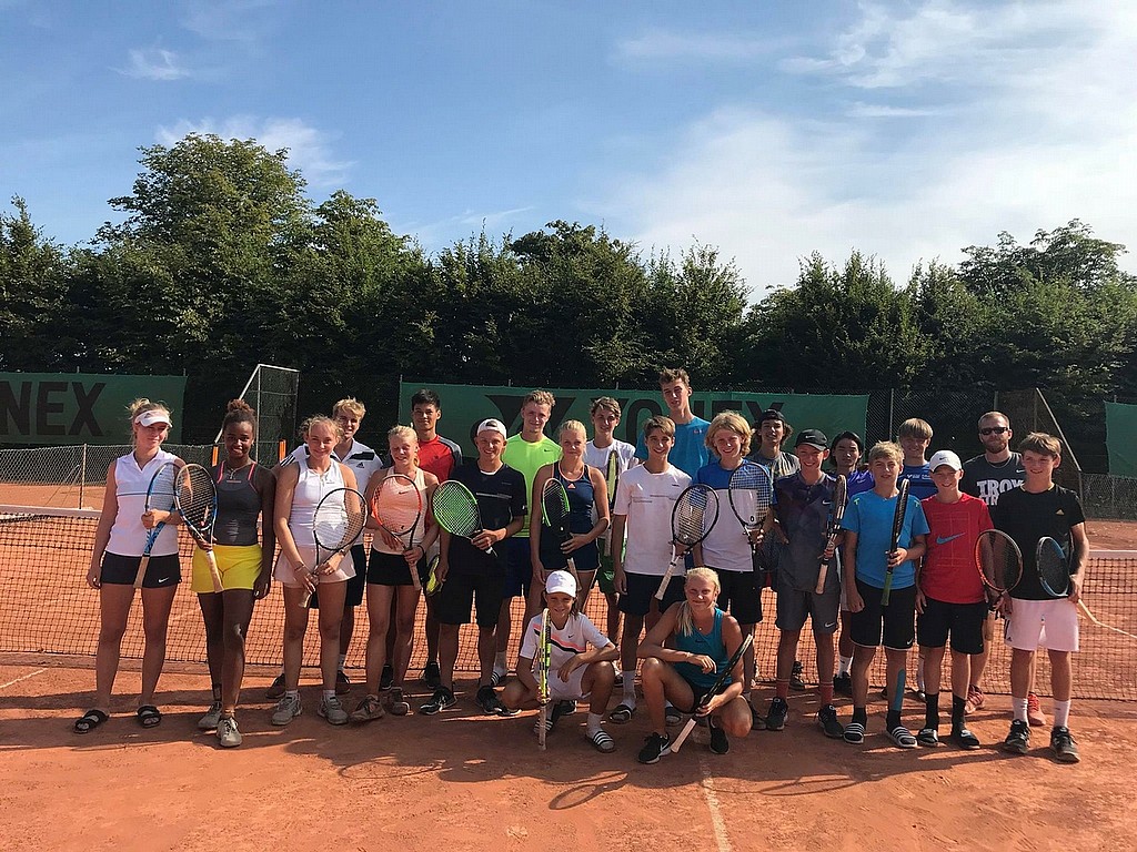 Tävlingsspelarna är på läger i samarbete med EuroElite. Klara, Marcus, Julia, Emma och Victor har sitt läger i Danmark. Adrian, Kasper och Marco är i Malmö. Bilden är från Danmark och från det lägret citerar vi delar av en text från EuroElites sociala medier: ”Vi är 22 st tjejer och killar från Sverige, Danmark och Tjeckien i åldrarna 12-17 år. Vi har börjat dagarna med ett stenhårt tennispass på tre timmar där fokus har legat på säkerhet, hitta motståndarens svaghet och mycket rörelse så träningen även blir ett fyspass. Vi avslutar varje dag med 2 timmar matchspel och därefter fys. Varje kväll avslutar vi med ett klassiskt teori pass.